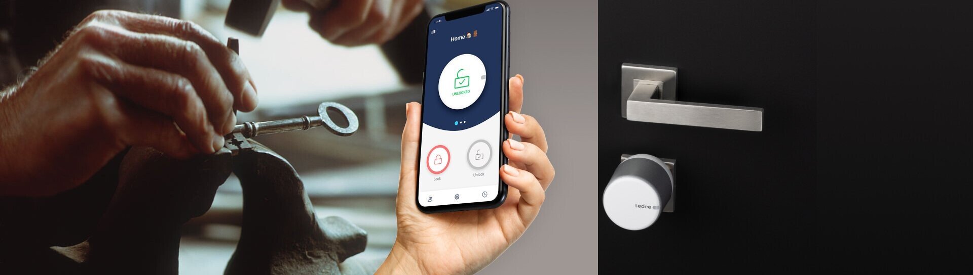 La serratura smart Tedee si connette a Internet e agli altri tuoi dispositivi. Puoi bloccare e sbloccare la porta di casa con il tuo smartphone, anche dall’altra parte del mondo.